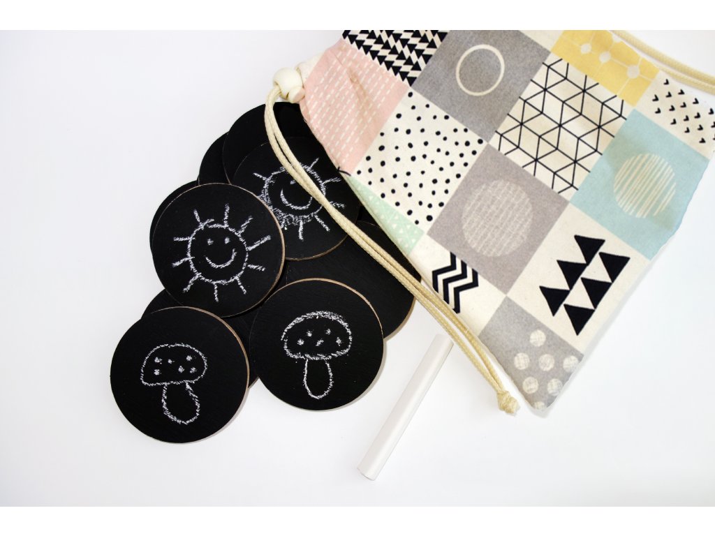 Součástí je 16 ks dřevěných koleček (8 párů). Průměr dřevěného kolečka je 6,5 cm. Součástí zboží je také látkový pytlíček (100% bavlna) velikosti 18 × 20 cm a 5 ks barevných kříd.