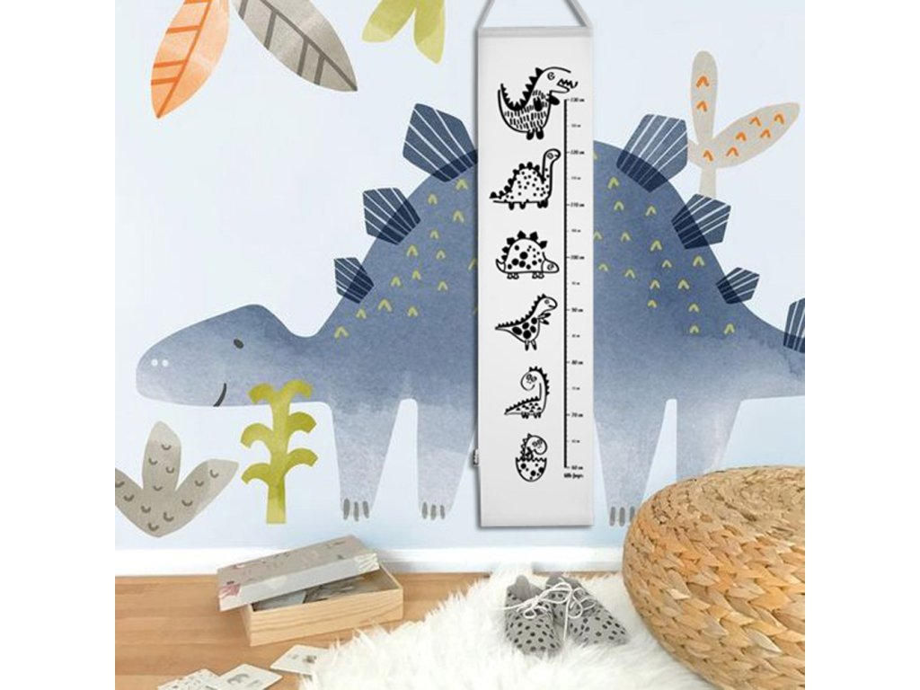 Černobílý látkový metr pro děti do délky 130 cm (velikost výrobku 20 × 90 cm) s dinosaury. Součástí výrobku jsou 4 ks textilních markerů (fixů): červená, žlutá, zelená a modrá. Vyroben ze 100% BIO bavlněného plátna, digitálně potištěného. Nahoře a dole vystužen dřevěnou kulatinou průměru 10 mm a nahoře zavěšeno na bílou stuhu.
