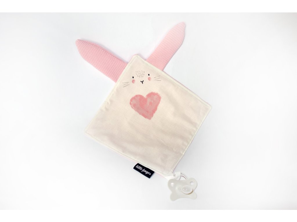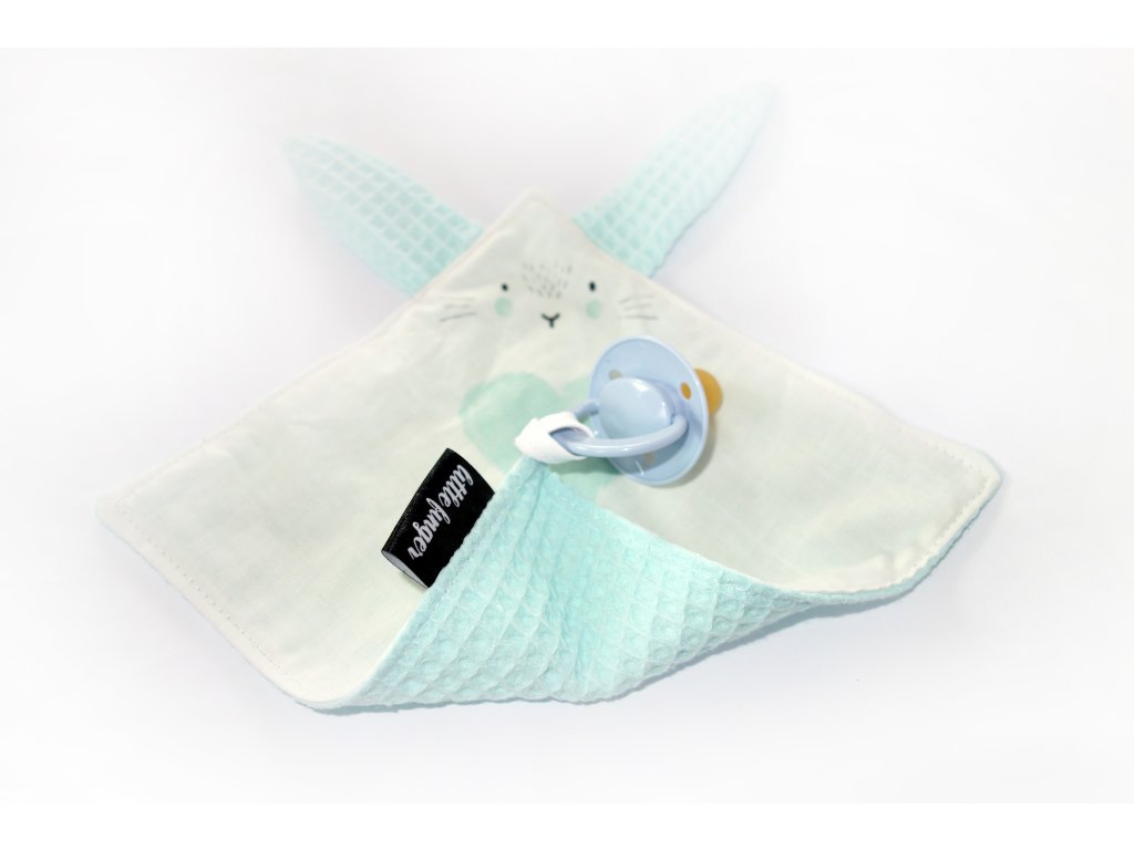 Muchláček Bunny je vyrobený ze 100% bio bavlněného plátna s certifikátem Öko-Tex Standard 100 / třídy I určené pro děti do 3 let. Z druhé strany a na ouškách použita 100% bavlněná látka vaflové struktury. Muchláček lze zavěsit na dudlík či hrazdičku. Dvě varinty, do poznámky k objednávce prosím napište výběr: růžová nevo tyrkysová.