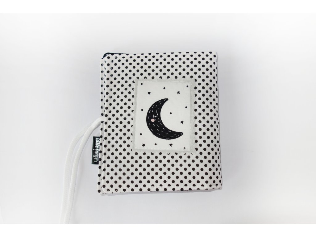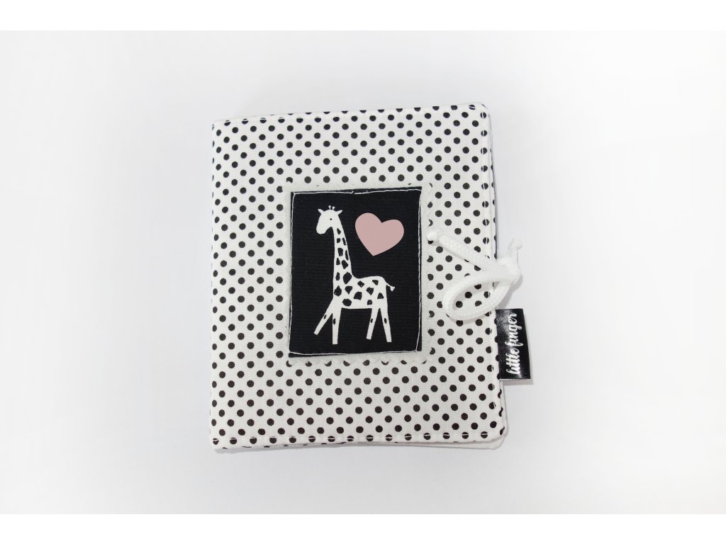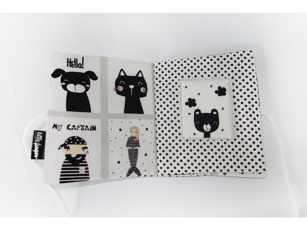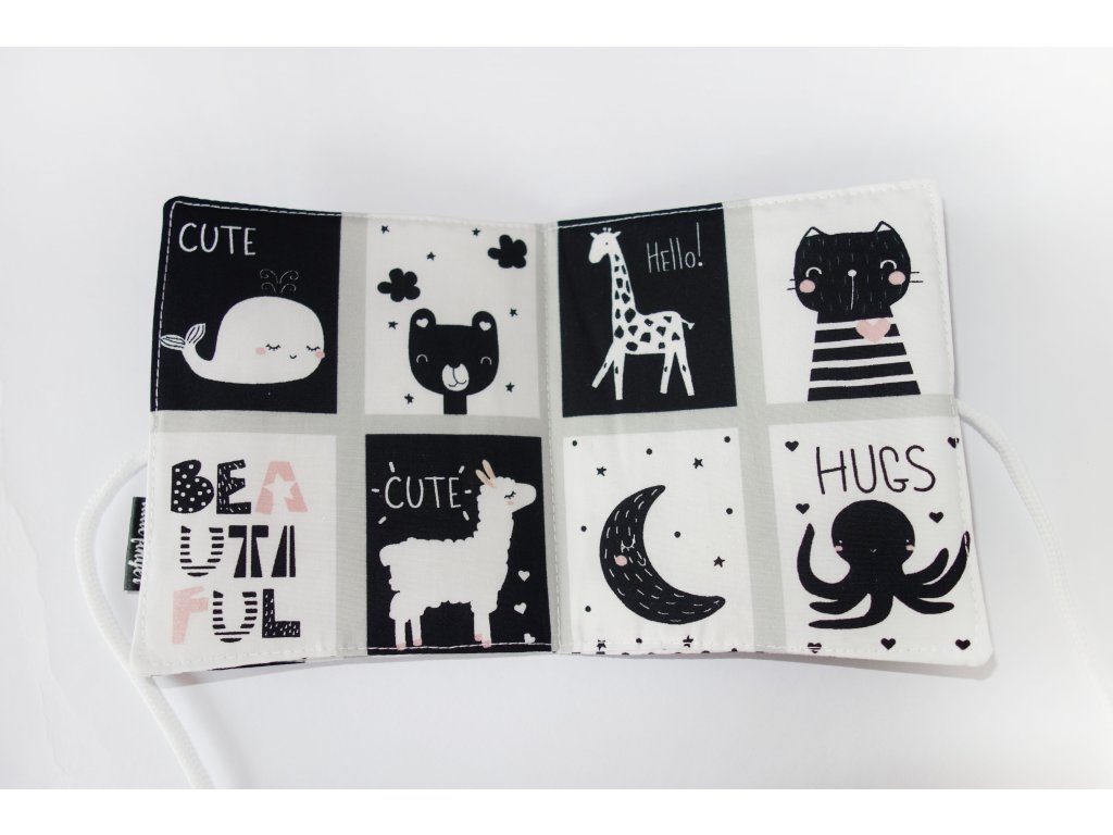Kontrastní, šustící, látková kniha. Černobílá, kontrastní barevnost rozvíjí zrakové funkce, zlepšují schopnosti koncentrace a povzbuzují zvídavost. Velikost 12 × 14 cm. Vyrobeno ze 100% bavlněného plátna s certifikací pro děti do 3 let. Uvnitř všitý potravinářský celofán. Vyrobeno v České republice.